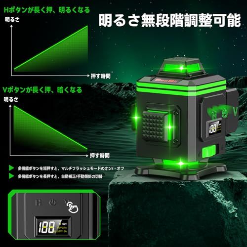 【2025 年最新改良の高精度16ラインレーザー墨出し器 R16】改良点:他の墨出し器とは異なり、本体には電量を表示するLCD ディスプレーが搭載されています。作業中のバッテリー残量が一目でわかり、電池切れの心配がありません。改良点:360回転可能な金属ベースを備え、レーザー線と正確な目盛りを参照しながら、機器を全方位に回転させることができます。作業の自由度が格段に向上します。改良点:2本の 360水平線と2本の360垂直線が組み合わされて、部屋全体をカバーします。赤色よりも視覚的に見やすいグリーンレーザーを採用し、明るくて正確な結果を簡単に得られます。レーザー基準はクラス2、1MW 以下で、家庭やオフィスで安全に使用できます。改良点:レーザーの明るさが無段階調節可能です。
