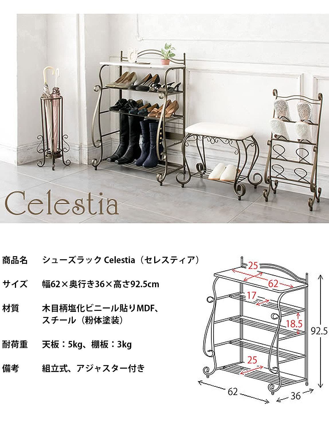 曲線をあしらった装飾の洗練されたデザイン、心地よさを醸し出すアンティークゴールドが人気の『Celestia(セレスティア)』シリーズのシューズラック。シューズラックやスリッパラックなどの玄関収納を有効活用すれば、狭い玄関周りを可愛く魅せることができます。また、忙しい朝や来客時もつまずいたり探したりすることなく、快適にお過ごしいただけます。鍵などが置ける天板と跳ね上げ式でブーツも収納できる棚が4段でとっても便利。レディースシューズは最大12足収納できます。