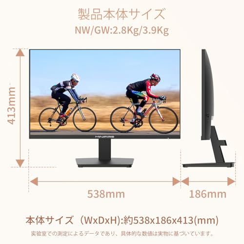 [画面サイズ] 24インチ モニター 、[最大解像度] 19201080、 [アスペクト比] 16:9、 [コントラスト比]1000:1、 [輝度] 250cd/ 、[色域] 72% NTSC、sRGB110%[色深度]16.7万色、8Bits、HDR10対応。