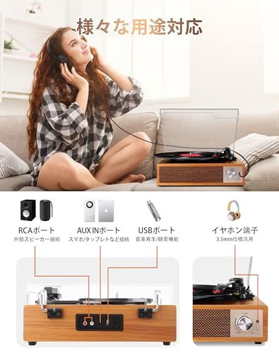 VOKSUN レコードプレーヤー Bluetooth送信と受信 USBで録音と音楽再生 スピーカー内蔵 RCAでスピーカー繋ぎ イヤホン接続 33 45 78回転と7 10 12インチ対応 AUX in 防塵蓋 日本語説明書 木目調 8 a 3 f 1650