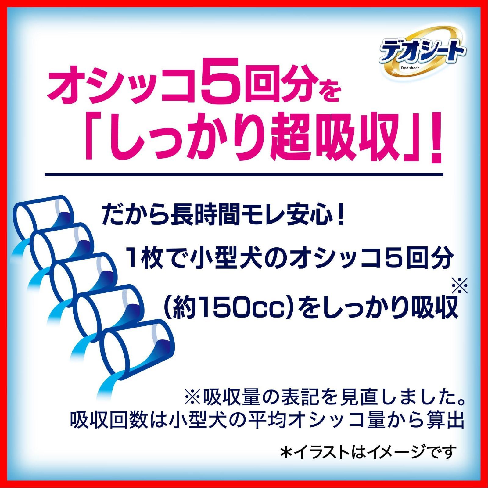 デオシート独自の瞬速とじこめ吸収体がオシッコを瞬間吸収して、表面サラサラ&オシッコ広がりが小さいペットシートです。高速吸収ポリマーがオシッコを瞬間吸収して長時間ニオイを閉じ込める無香消臭タイプ。オシッコ5回分(約150cc)をしっかり超吸収。※小型犬の平均オシッコ量から算出。シートサイズ:44×32cm(トレーにぴったり)