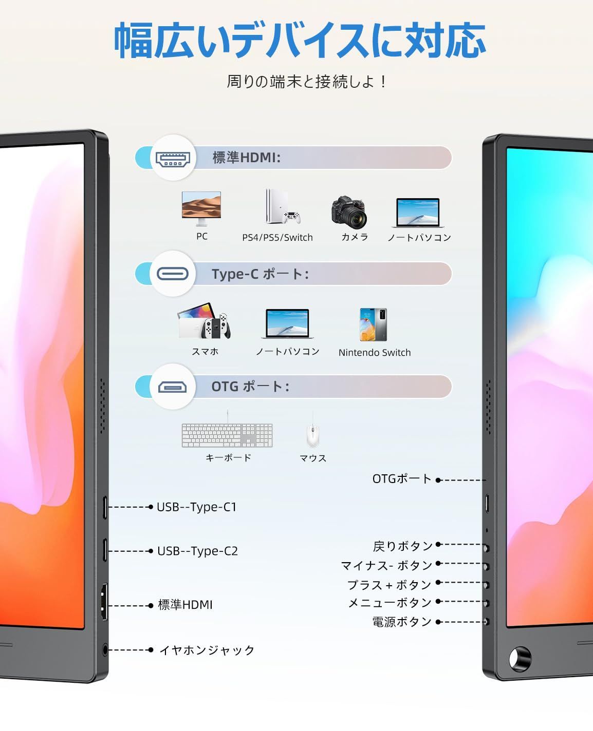 【幅広く接続に対応】パソコン モバイルモニターの接続端子には汎用性の高いみに標準HDMI・USB Type-Cの2種類を搭載します。インターフェイスが豊富なので、新しいデバイスなら問題なく対応できます。USB Type-C端子はMacBookやSurfaceに加えて、最新のiPad ProやAndroidスマホにも搭載されており、Type-Cの1つは本体の充電用に使われますが、変換ケーブルを介さずにさまざまなデバイスが使用できるのが魅力です。また、マウスやキーボードを接続できるOTGポート(microUSB)も備えています。ケーブル等が付属品に入っていて、追加での購入の必要がないです。
