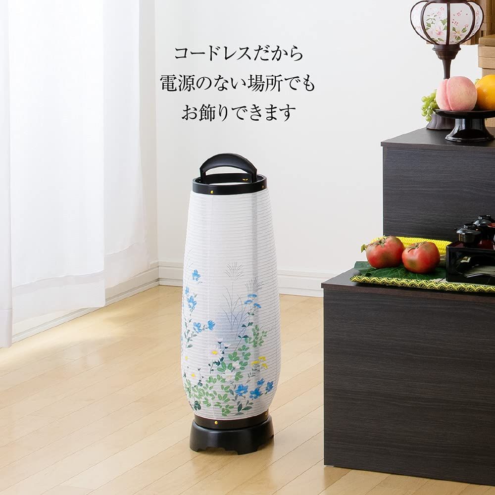 寸法:高さ55cm×巾18cm/材質:プラスチック製/火袋:和紙張(桔梗萩)/電装:LED回転コードレス電池灯 回転筒付、プッシュ式スイッチ、1台に単4電池4個使用(テスト用アルカリ電池8個付き)、アルカリ電池で約40時間連続点灯可能/備考:化粧紙箱入り(箱寸法…縦57cm×横20cm×高さ19cm) 2箱