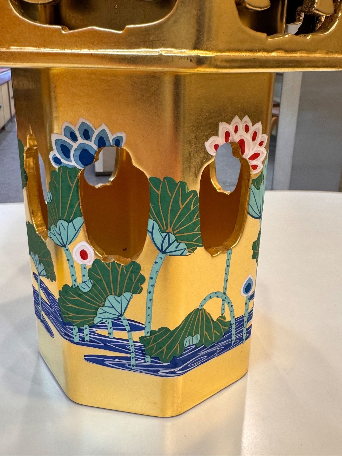 供笥 木製 八角 内外金箔押し 蓮水彩色