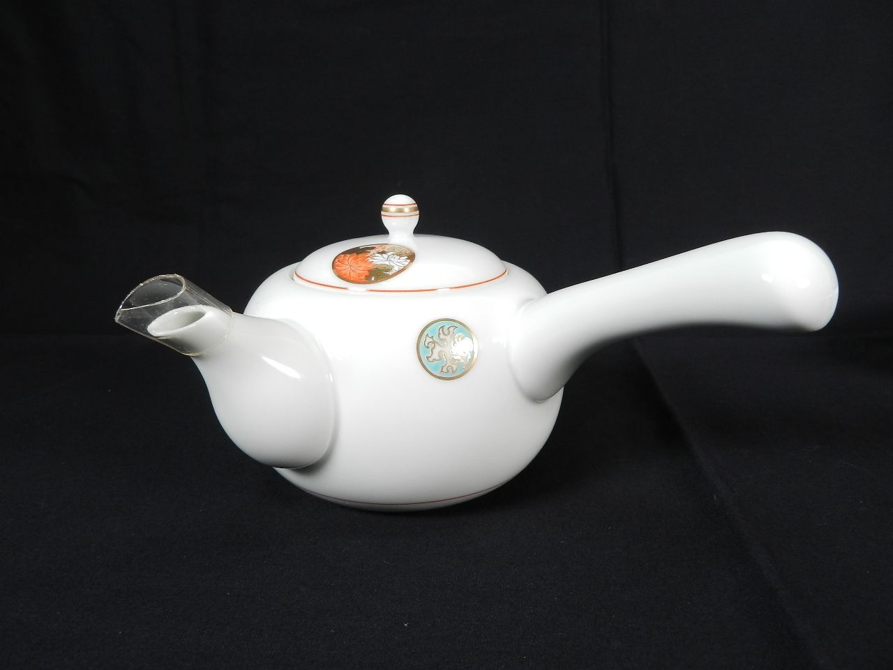 ・蘭、竹、梅、菊と中国の吉祥の四君子と西海青海波を透白磁に赤絵付けされた、深川製磁の寿赤絵 急須揃えです。