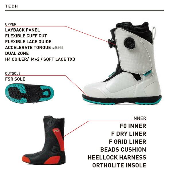 アウターはバインディングとのマッチングを考慮したデザインと、よりしなやかなフレックスに対応したレイバックパネルと自然な屈曲を生み出すFLEXIBLE カフカット、甲に優しくフィットするFLEXIBLE LACE GUIDE、防水性を高める シームレスデザインが足元を引き立たせます。