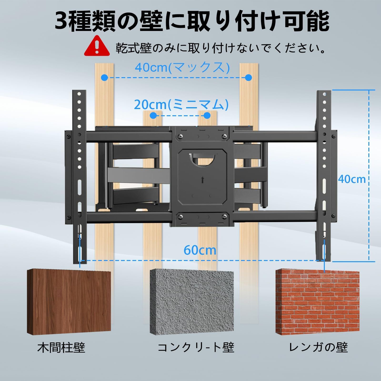 【安定感があり耐震性にも優れる】テレビ壁掛け金具は、冷間圧延鋼材素材で作られて、強力なデュアル 6 アーム設計でテレビを壁に安全に固定し、ニーズに合わせて調整できます。 安全ロック・滑り止め・落下防止設計など安定感を高める配慮もあります。テレビが倒れる心配がなく、ご安心に利用いただけます