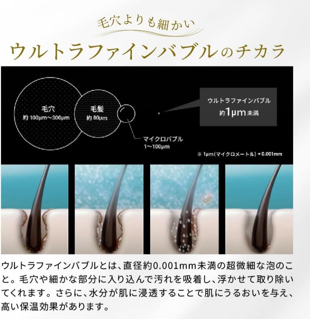 ・トルネードミスト水流 1つの吐出口あたり、1秒間に約2,000回転(1分間に約12万回)の高速うず流でウルトラファインバブルを生成。さらに水流が吐出する際、外気を巻き込む機構により、安定した気泡を発生させます。(特許-6717991) 16穴の吐水穴で従来型に比べ、広がりを持たせた水流は安定した水温(湯温)での吐水を実現させています。