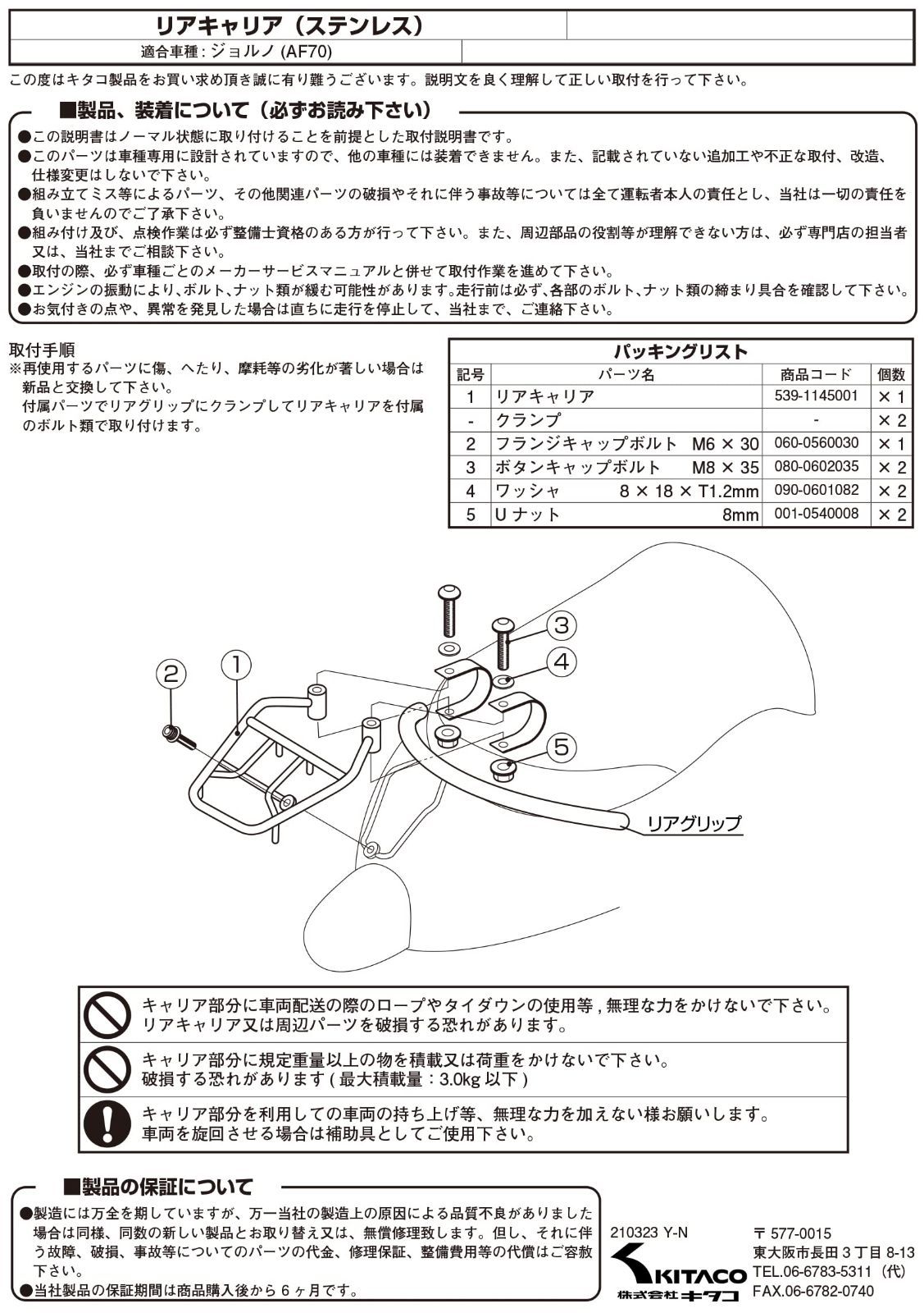 キャリア寸法 長さ174 幅169 mm 最大積載量3 0 kg ステンレス製 ジョルノ リアキャリア 80 539 11450 キタコ KITACO