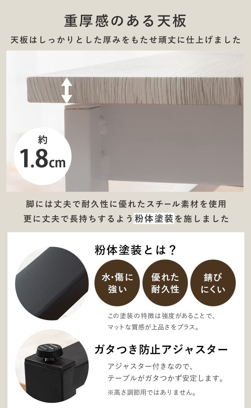 【異素材の組合わせでデザイン性UP】リアルで本物に近い木目調シート張りの天板と耐久性に優れたスチール脚がインテリアとしての存在感を発揮。