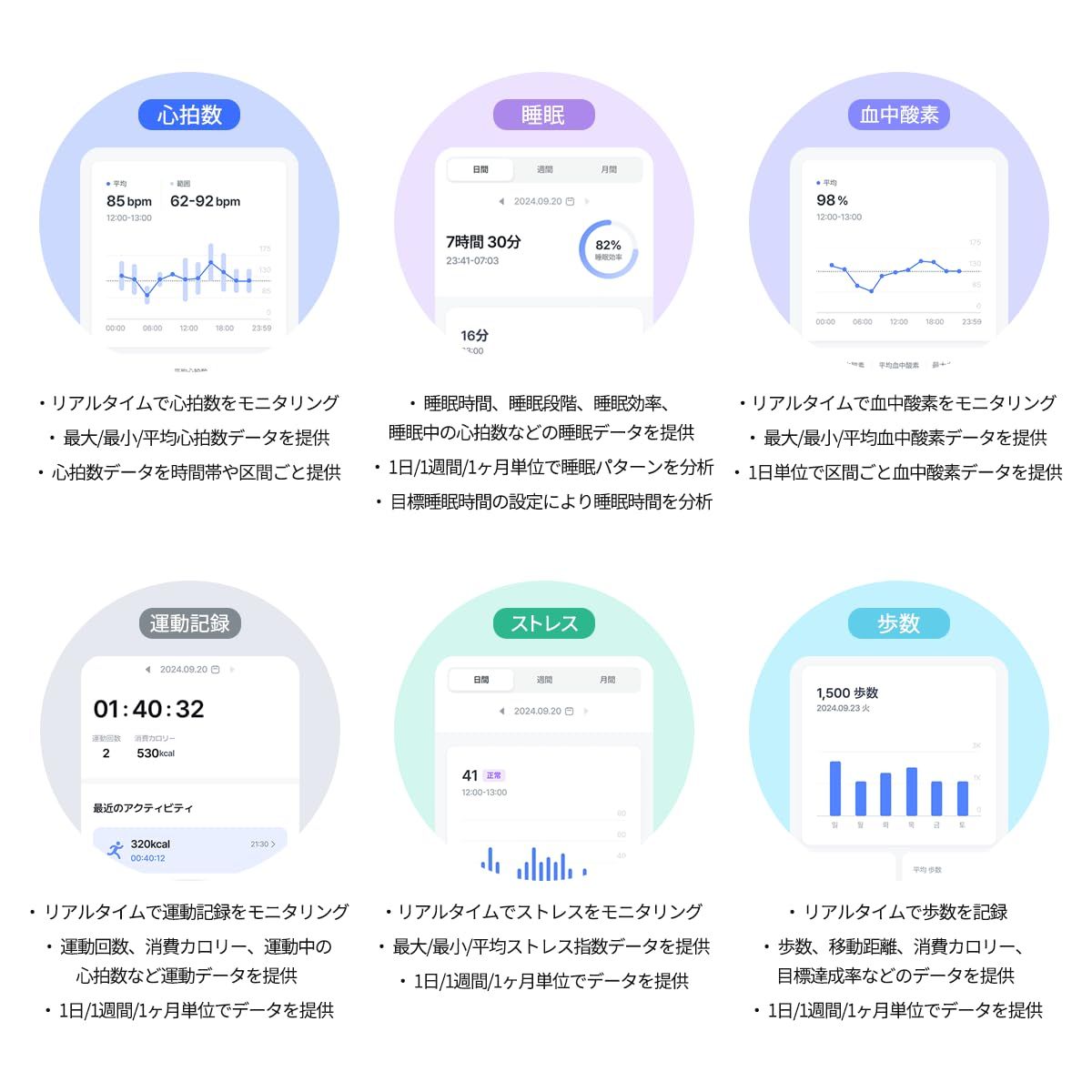 ??【6つの機能で健康管理】① 睡眠データ記録、② 心拍数モニタリング、③ 血中酸素チェック、④ ストレス管理、⑤ 運動記録、⑥ 歩数記録