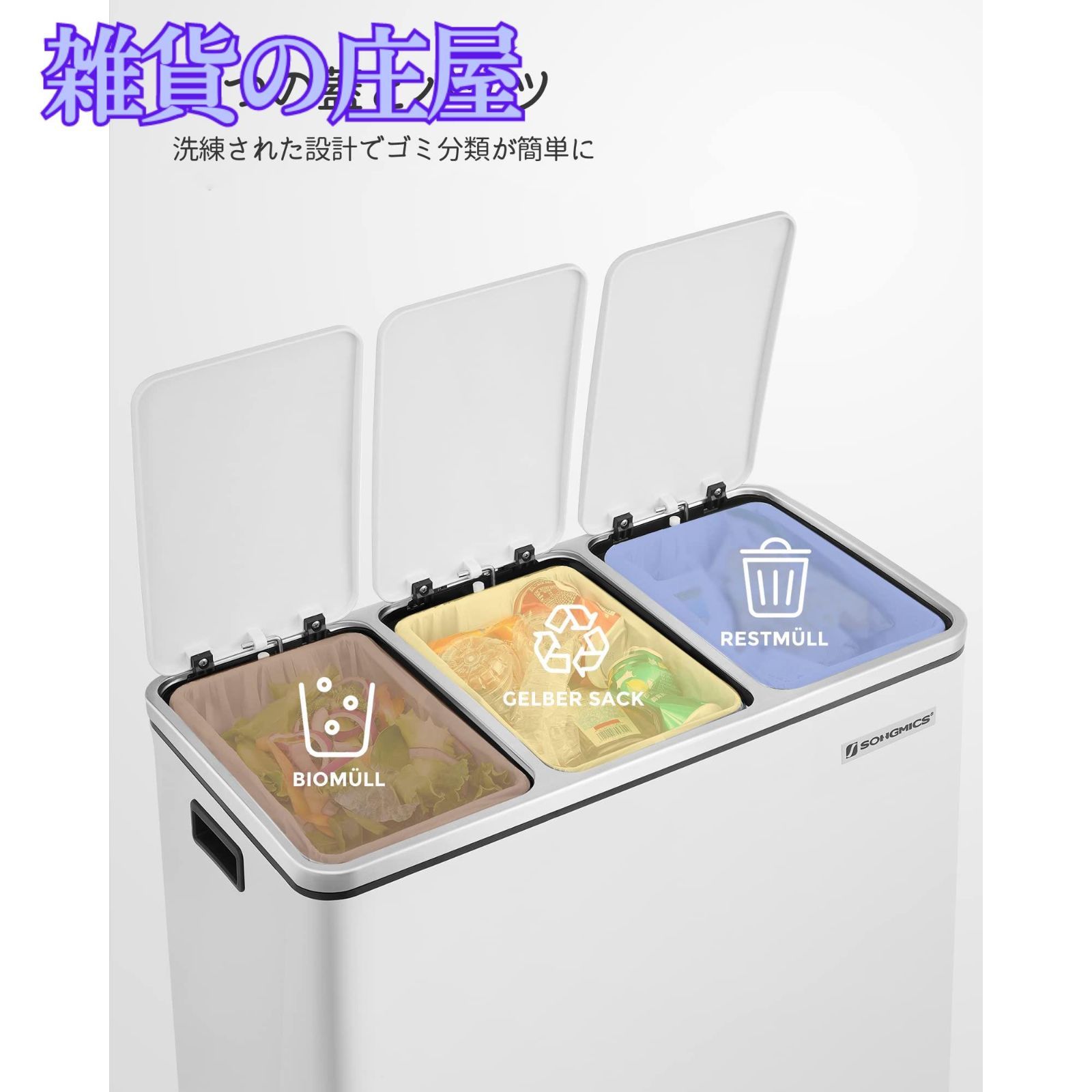 【万全なフォロー体制】SONGMICSは製品の品質確保、より良いサービスをご提供できるよう社員一同懸命に努めてまいります。商品に関するご質問等がございましたら、ご遠慮なく出品者名(Songmics JP)をクリックして弊店までご連絡下さい。サイズ 外箱:幅61.5cm(持ち手を含め、幅約62.5cm)×奥行31.5cm(ペダルを含まない)×高さ56cm;内箱:幅18cm×奥行26.5cm×高さ49cm;