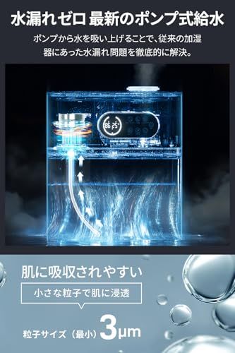 【ハイブリッド式&水漏れ防止「ポンプ式」】 「超音波式」と「ハイブリッド式」の2種類加湿方式が選択可能。音や消費電力を抑えたい時は超音波式、乾燥が厳しい場合はハイブリッド式で瞬時に湿度アップします。また、従来の加湿器で懸念された水漏れを根本から解決するため、タンクとミスト発生部を分離した「ポンプ式」構造を採用。水は小型ポンプで汲み上げられ、水漏れの心配がなく、オフィスの書類のそばや貴重な家具の上でも安心。