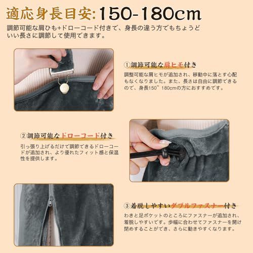 【細かいポイント・男女兼用】75*120cmのサイズ、調節可能な肩ひもドローコード付きで、150180cmの女性も男性も自分の身長に合わせてちょうどいい長さに調節して使用できます。服みたいに着ることができ、ダブルファスナーで必要に応じて裾の開閉が出来るのは便利です。着るには家事や在宅ワークをしたりも邪魔ないです。家事しながらも暖かさを感じられます。