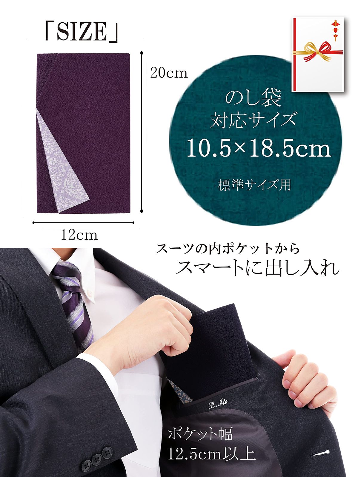 <男女両用 オリジナルカラー>「紺×花菱子葵」 「紫×鳳凰」の2カラー。当社だけのオリジナルカラーでご用意しています。 格調高く、おしゃれな色使いで、年齢、性別を問わず、慶弔どんな場面でもどなたにもお使い頂けます。<ポケットタイプで使いやすい> たたむタイプの袱紗とちがって、ポケットに差し込むだけ。スマートに出し入れできます。