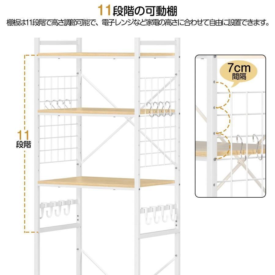 冷蔵庫上ラック ゴミ箱上ラック 洗濯機ラック W 60 D 40 H 180 cm 11段調整 ワイヤーネット収納 レンジ台 レンジラック 食器棚 大型電子レンジ対応 フック 付き