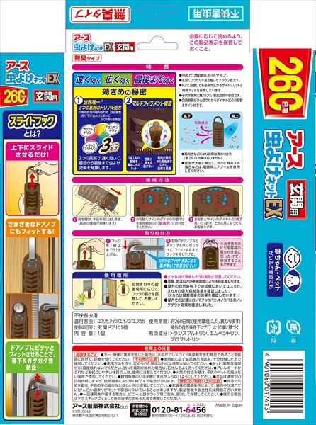 玄関につるだけ簡単なネットタイプの虫よけです。3つの薬剤で、速く効いて、最初から最後まで虫よけの効果を発揮します。お取替えサイン付です。※HD函仕様です。